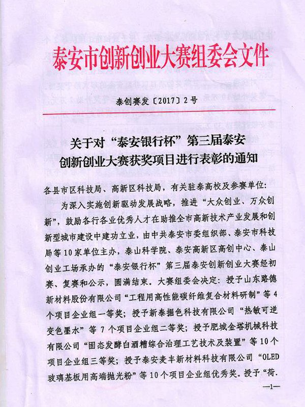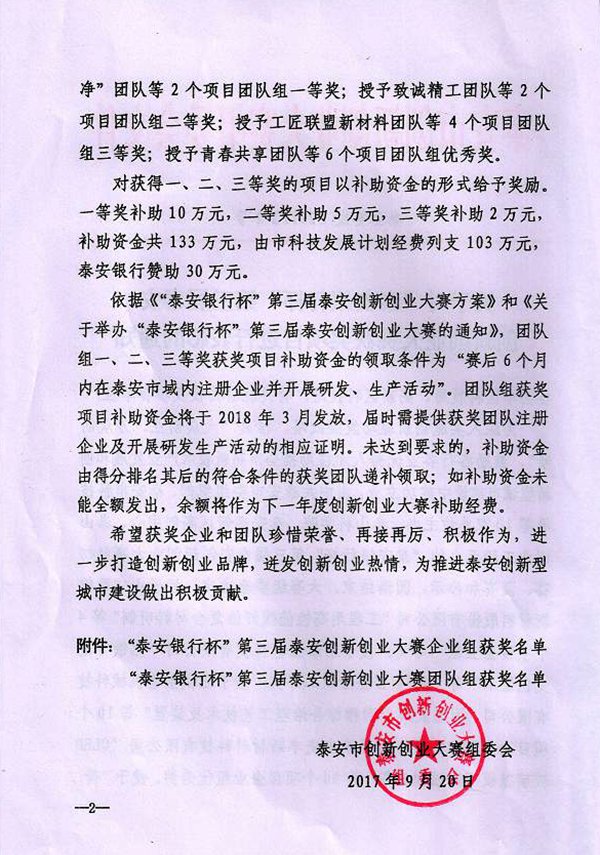 公司榮獲“泰安銀行杯”第三屆泰安創(chuàng)新創(chuàng)業(yè)大賽優(yōu)秀獎